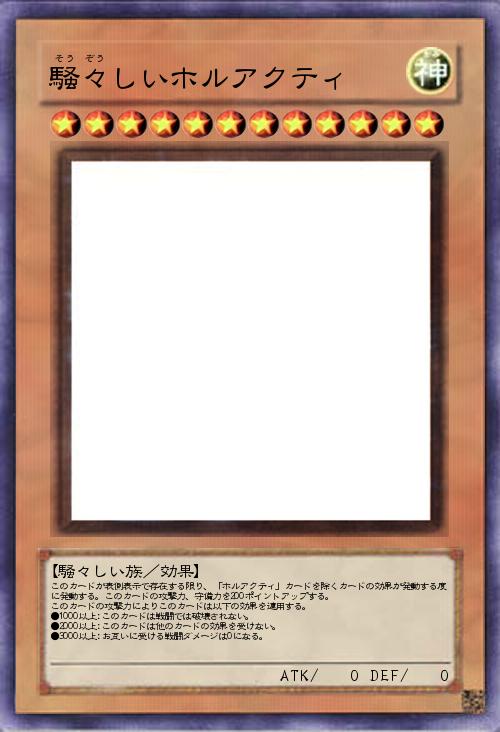 | このカードが表側表示で存在する限り、「ホルアクティ」カードを除くカードの効果が発動する度に発動する。このカードの攻撃力、守備力を200ポイントアップする。 このカードの攻撃力によりこのカードは以下の効果を適用する。 ●1000以上:このカードは戦闘では破壊されない。 ●2000以上:このカードは他のカードの効果を受けない。 ●3000以上:お互いに受ける戦闘ダメージは0になる。 | |||