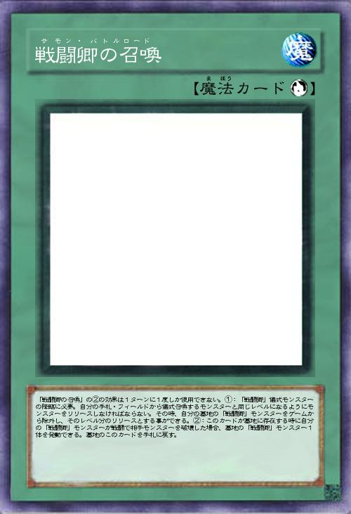 | 「戦闘卿の召喚」の②の効果は1ターンに1度しか使用できない。①:「戦闘卿」儀式モンスターの降臨に必要。自分の手札・フィールドから儀式召喚するモンスターと同じレベルになるようにモンスターをリリースしなければならない。その時、自分の墓地の「戦闘卿」モンスターをゲームから除外し、そのレベル分のリリースとする事ができる。②:このカードが墓地に存在する時に自分の「戦闘卿」モンスターが戦闘で相手モンスターを破壊した場合、墓地の「戦闘卿」モンスター1体を発動できる。墓地のこのカードを手札に戻す。 | |||