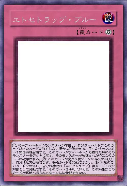 | ①:相手フィールドにモンスターが存在し、自分フィールドにこのカード以外のカードが存在しない場合に発動できる。手札からモンスター1体を特殊召喚する。このカードがフィールドから離れた時にそのモンスターをデッキに戻す。そのモンスターが破壊された時にこのカードは破壊される。②:このカードが魔法&罠ゾーンに存在する限り、自分は通常召喚できず、魔法カードを発動できない。③:墓地のこのカードを除外し、自分の墓地の「エトセトラップ」罠カード1枚を対象として発動できる。そのカードを手札に加える。この効果はこのカードが墓地へ送られたターンには発動できない。 | |||