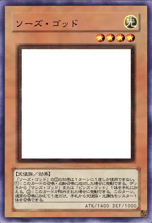 | 「ソーズ・ゴッド」の②の効果は1ターンに1度しか使用できない。①:このカードの召喚・反転召喚に成功した場合に発動できる。デッキから「マンズ・ゴッド」または「ピンズ・ゴッド」1体を手札に加える。②:このカードが除外された場合に発動できる。このターン、通常の召喚に加えて1度だけ、手札から天使族・光属性モンスター1体を召喚できる。 | |||