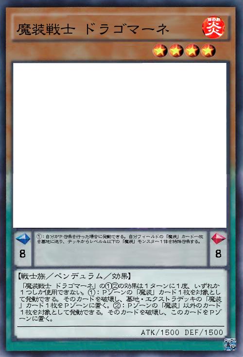 | 「魔装戦士 ドラゴマーネ」の①②の効果は1ターンに1度、いずれか1つしか使用できない。①:Pゾーンの「魔装」カード1枚を対象として発動できる。そのカードを破壊し、墓地・エクストラデッキの「魔装」カード1枚をPゾーンに置く。②:Pゾーンの「魔装」以外のカード1枚を対象として発動できる。そのカードを破壊し、このカードをPゾーンに置く。 | |||