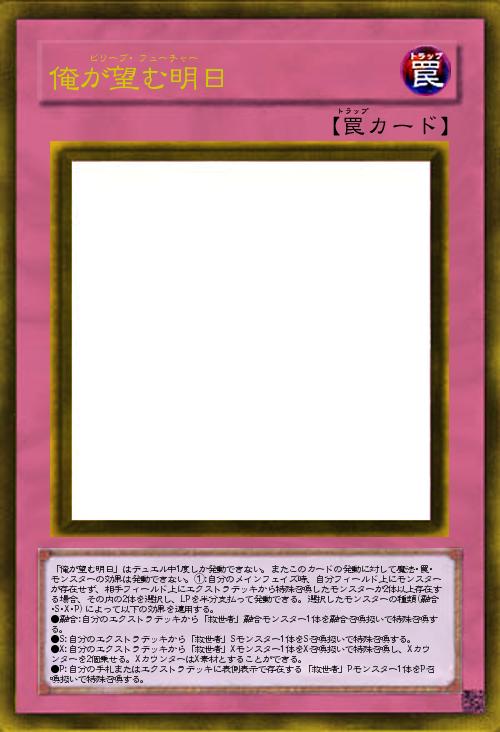| 「俺が望む明日」はデュエル中1度しか発動できない。またこのカードの発動に対して魔法・罠・モンスターの効果は発動できない。①:自分のメインフェイズ時、自分フィールド上にモンスターが存在せず、相手フィールド上にエクストラデッキから特殊召喚したモンスターが2体以上存在する場合、その内の2体を選択し、LPを半分支払って発動できる。選択したモンスターの種類(融合・S・X・P)によって以下の効果を適用する。 ●融合:自分のエクストラデッキから「救世者」融合モンスター1体を融合召喚扱いで特殊召喚する。 ●S:自分のエクストラデッキから「救世者」Sモンスター1体をS召喚扱いで特殊召喚する。 ●X:自分のエクストラデッキから「救世者」Xモンスター1体をX召喚扱いで特殊召喚し、Xカウンターを2個乗せる。XカウンターはX素材とすることができる。 ●P:自分の手札またはエクストラデッキに表側表示で存在する「救世者 | |||