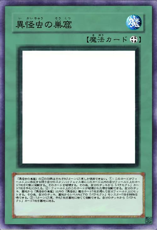 | 「異怪虫の巣窟」の②の効果はそれぞれ1ターンに1度しか使用できない。①:このカードがフィールド上に存在する限り自分のスタンバイフェイス毎にこのカード以外の自分フィールド上のカード1枚を対象に発動する。そのカードを破壊する。その後、自分のデッキから「パラセクト」カード1枚を手札に加える。②:フィールド上のこのカードが破壊された場合発動できる。自分のデッキ、墓地から「異怪虫の巣窟」以外の「異怪虫」魔法カード1枚を選んで自分フィールド上にセットする。その後、自分のデッキ、墓地からレベル4以下の「パラセクト」モンスター1体を特殊召喚できる。③:1ターンに1度、手札1枚を墓地に捨てて発動できる。自分のデッキから「パラセクト」カード1枚を墓地に送る。 | |||