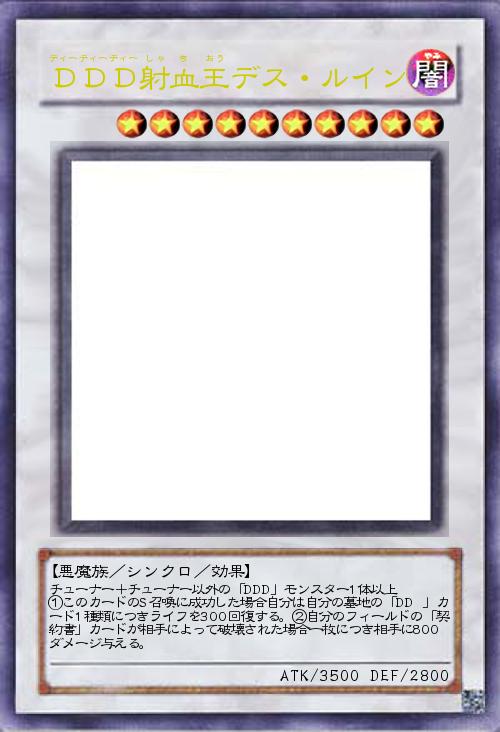 | チューナー+チューナー以外の「DDD」モンスター1体以上 ①このカードのS召喚に成功した場合自分は自分の墓地の「DD 」カード1種類につきライフを300回復する。②自分のフィールドの「契約書」カードが相手によって破壊された場合一枚につき相手に800ダメージ与える。 | |||