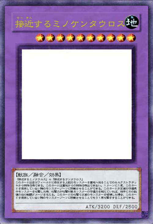 | 「接近するミノタウルス」+「接近するケンタウロス」 このカードは自分フィールドに存在する上記のモンスターを墓地へ送ることでのみエクストラデッキから特殊召喚できる。このカードは墓地からの特殊召喚はできない。1ターンに1度、このカードを使用していない隣のモンスターゾーンに移動させることができる。このカードが正面の守備表示モンスターを攻撃した時、攻撃力が攻撃対象モンスターの守備力を超えていれば、相手にその数値の倍の戦闘ダメージを与える。このカードの攻撃で正面のモンスターを破壊した場合、このカードを使用していない隣のモンスターゾーンに移動させることでもう1度攻撃をすることができる。 | |||