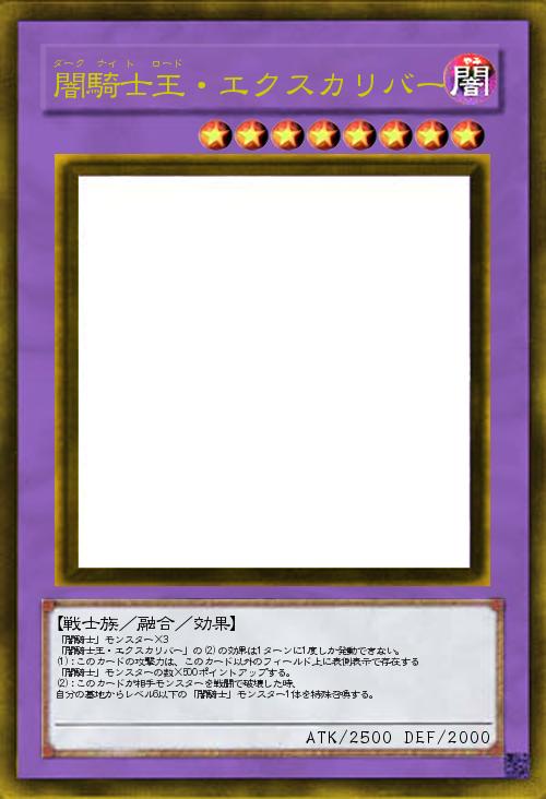 | 「闇騎士」モンスター×3 「闇騎士王・エクスカリバー」の(2)の効果は1ターンに1度しか発動できない。 (1):このカードの攻撃力は、このカード以外のフィールド上に表側表示で存在する 「闇騎士」モンスターの数×500ポイントアップする。 (2):このカードが相手モンスターを戦闘で破壊した時、 自分の墓地からレベル6以下の「闇騎士」モンスター1体を特殊召喚する。 | |||