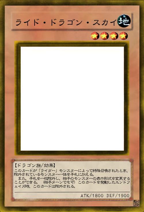 | このカードが「ライダー」モンスターによって特殊召喚されたとき、除外されているモンスター一体を手札に加える。 また、手札を一枚除外し、相手のモンスターの表示形式を変更することができる。(相手ターンでも可)このカードを発動したエンドフェイズ時、このカードは除外される。 | |||