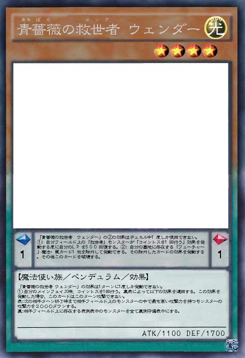 | 「青薔薇の救世者 ウェンダー」の効果は1ターンに1度しか発動できない。 ①:自分のメインフェイズ時、コイントスを1回行う。裏表によって以下の効果を適用する。この効果を発動した場合、このカードはこのターン攻撃できない。 表:次の相手ターン終了時まで相手フィールド上のモンスターの中で最も高い攻撃力を持つモンスターの攻撃力を2000ダウンする。 裏:相手フィールド上に存在する表側表示のモンスターを全て裏側守備表示にする。 | |||