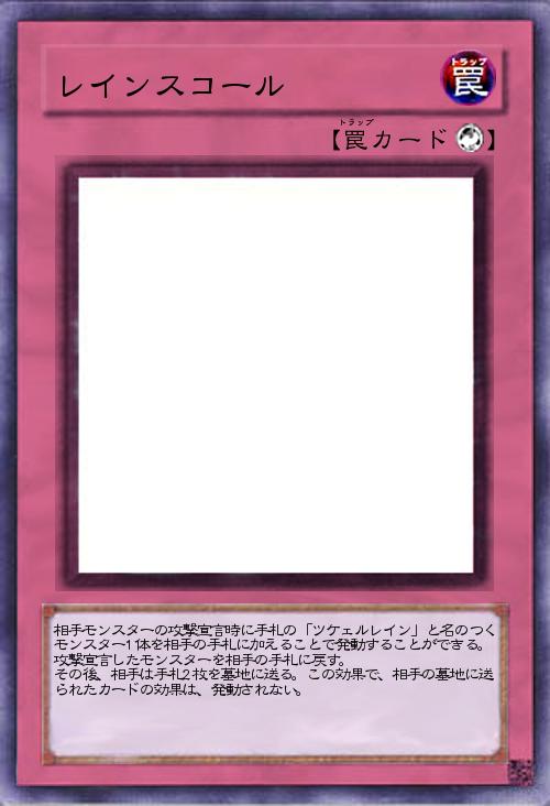 | 相手モンスターの攻撃宣言時に手札の「ツケェルレイン」と名のつくモンスター1体を相手の手札に加えることで発動することができる。 攻撃宣言したモンスターを相手の手札に戻す。 その後、相手は手札2枚を墓地に送る。この効果で、相手の墓地に送られたカードの効果は、発動されない。 | |||