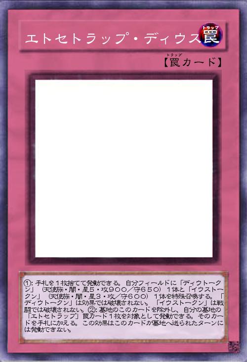 | ①:手札を1枚捨てて発動できる。自分フィールドに「ディウトークン」(天使族・闇・星5・攻900/守650)1体と「イウストークン」(天使族・闇・星3・攻/守600)1体を特殊召喚する。「ディウトークン」は効果では破壊されない。「イウストークン」は戦闘では破壊されない。②:墓地のこのカードを除外し、自分の墓地の「エトセトラップ」罠カード1枚を対象として発動できる。そのカードを手札に加える。この効果はこのカードが墓地へ送られたターンには発動できない。 | |||