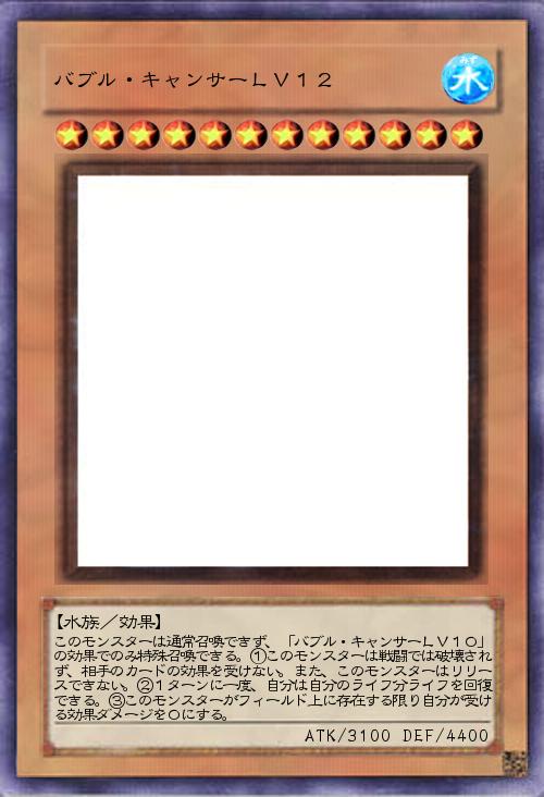 | このモンスターは通常召喚できず、「バブル・キャンサーLV10」の効果でのみ特殊召喚できる。①このモンスターは戦闘では破壊されず、相手のカードの効果を受けない。また、このモンスターはリリースできない。②1ターンに一度、自分は自分のライフ分ライフを回復できる。③このモンスターがフィールド上に存在する限り自分が受ける効果ダメージを0にする。 | |||