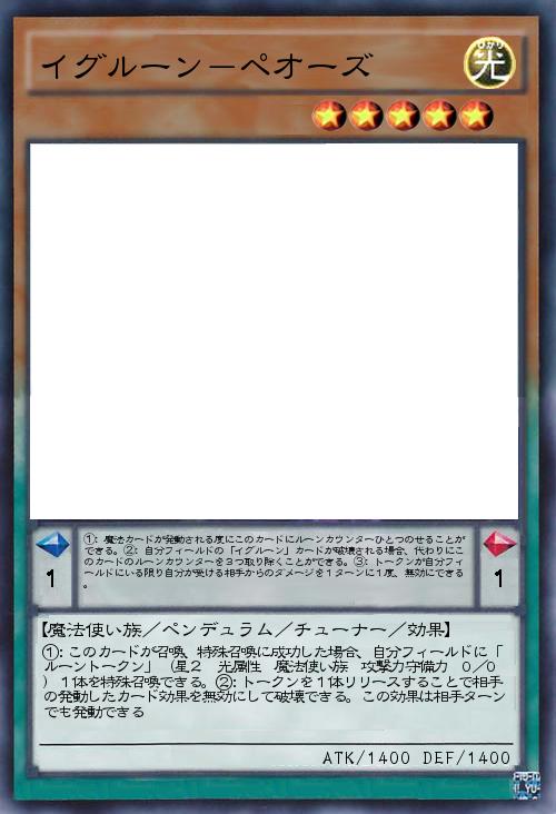 | ①:魔法カードが発動される度にこのカードにルーンカウンターひとつのせることができる。②:自分フィールドの「イグルーン」カードが破壊される場合、代わりにこのカードのルーンカウンターを3つ取り除くことができる。③:トークンが自分フィールドにいる限り自分が受ける相手からのダメージを1ターンに1度、無効にできる。 | |||