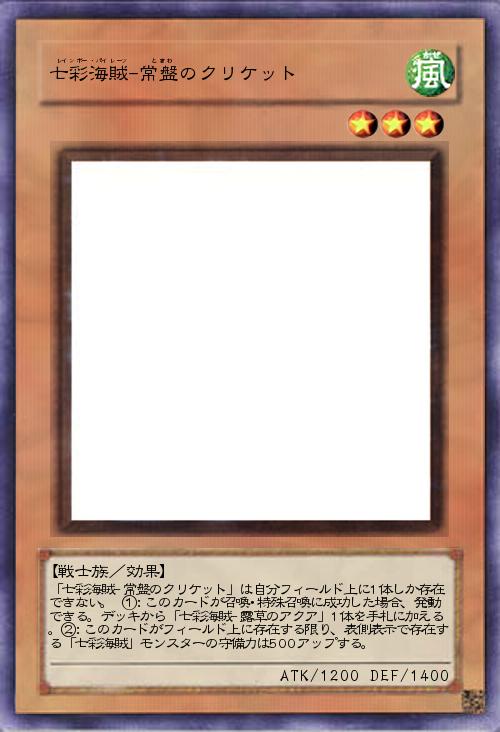 | 「七彩海賊-常盤のクリケット」は自分フィールド上に1体しか存在できない。 ①:このカードが召喚・特殊召喚に成功した場合、発動できる。デッキから「七彩海賊-露草のアクア」1体を手札に加える。②:このカードがフィールド上に存在する限り、表側表示で存在する「七彩海賊」モンスターの守備力は500アップする。 | |||