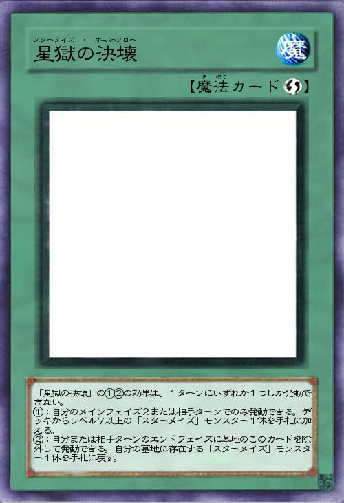 | 「星獄の決壊」の①②の効果は、1ターンにいずれか1つしか発動できない。 ①:自分のメインフェイズ2または相手ターンでのみ発動できる。デッキからレベル7以上の「スターメイズ」モンスター1体を手札に加える。 ②:自分または相手ターンのエンドフェイズに墓地のこのカードを除外して発動できる。自分の墓地に存在する「スターメイズ」モンスター1体を手札に戻す。 | |||