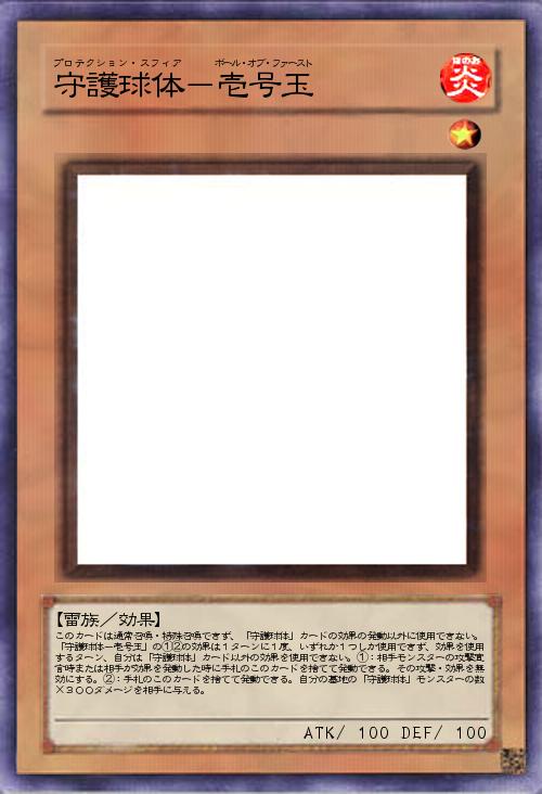 | このカードは通常召喚・特殊召喚できず、「守護球体」カードの効果の発動以外に使用できない。「守護球体-壱号玉」の①②の効果は1ターンに1度、いずれか1つしか使用できず、効果を使用するターン、自分は「守護球体」カード以外の効果を使用できない。①:相手モンスターの攻撃宣言時または相手が効果を発動した時に手札のこのカードを捨てて発動できる。その攻撃・効果を無効にする。②:手札のこのカードを捨てて発動できる。自分の墓地の「守護球体」モンスターの数×300ダメージを相手に与える。 | |||
