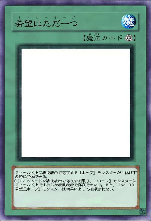 | フィールド上に表側表示で存在する「ホープ」モンスターが1体以下の時に発動できる。 ①:このカードが表側表示で存在する限り、「ホープ」モンスターはフィールド上で1枚しか表側表示で存在できない。また、「No.39 希望皇ホープ」モンスターは効果によって破壊されない。 | |||