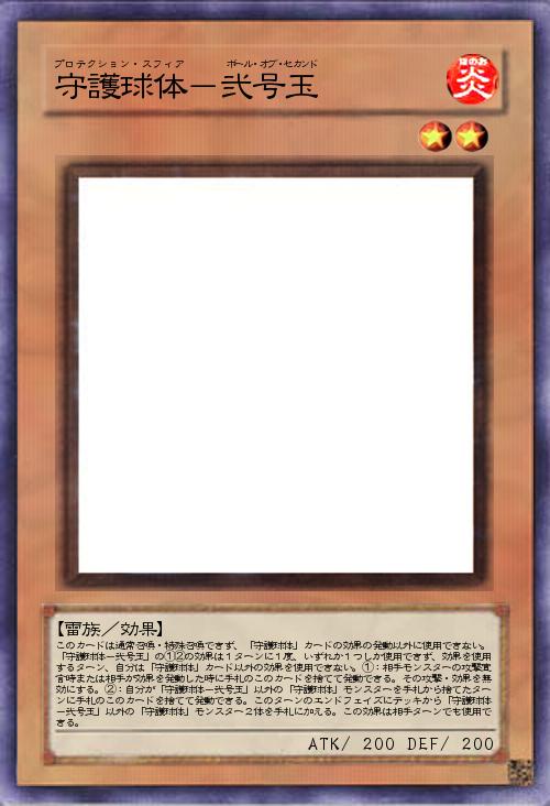 | このカードは通常召喚・特殊召喚できず、「守護球体」カードの効果の発動以外に使用できない。「守護球体-弐号玉」の①②の効果は1ターンに1度、いずれか1つしか使用できず、効果を使用するターン、自分は「守護球体」カード以外の効果を使用できない。①:相手モンスターの攻撃宣言時または相手が効果を発動した時に手札のこのカードを捨てて発動できる。その攻撃・効果を無効にする。②:自分が「守護球体-弐号玉」以外の「守護球体」モンスターを手札から捨てたターンに手札のこのカードを捨てて発動できる。このターンのエンドフェイズにデッキから「守護球体-弐号玉」以外の「守護球体」モンスター2体を手札に加える。この効果は相手ターンでも使用できる。 | |||