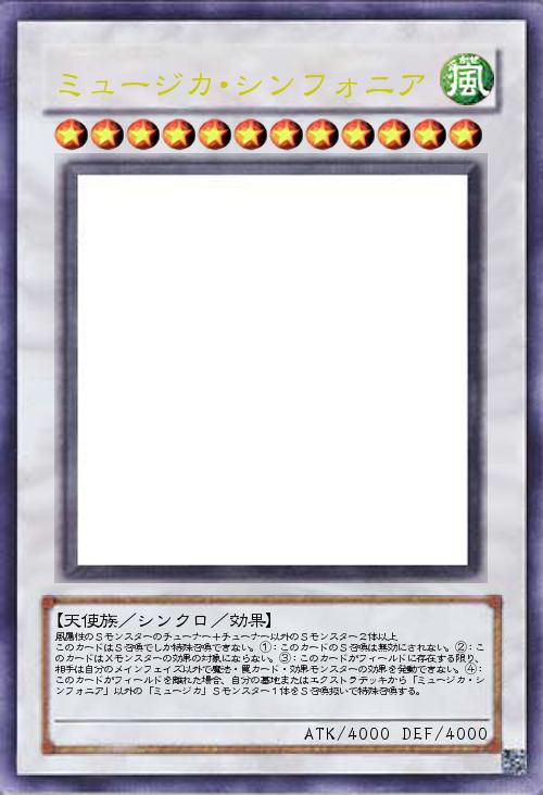 | 風属性のSモンスターのチューナー+チューナー以外のSモンスター2体以上 このカードはS召喚でしか特殊召喚できない。①:このカードのS召喚は無効にされない。②:このカードはXモンスターの効果の対象にならない。③:このカードがフィールドに存在する限り、相手は自分のメインフェイズ以外で魔法・罠カード・効果モンスターの効果を発動できない。④:このカードがフィールドを離れた場合、自分の墓地またはエクストラデッキから「ミュージカ・シンフォニア」以外の「ミュージカ」Sモンスター1体をS召喚扱いで特殊召喚する。 | |||