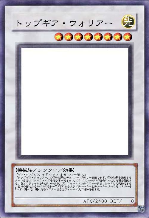 | 「ギア・シンクロン」+「シンクロン」モンスター1体以上 「トップギア・ウォリアー」の②の効果はデュエル中に1回しか使用できず、②の効果を発動するターン自分はバトルフェイズを行う事ができない。①:このカードがS召喚に成功した場合発動する。自分のデッキから1枚ドローする。②:フィールド上のこのカードをリリースして発動できる。自分の墓地からレベルの合計が7以下になるようにチューナーとチューナー以外のモンスターを1体ずつ選んで、選んだモンスターを自分フィールド上に特殊召喚する。 | |||