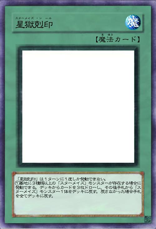 | 「星獄剋印」は1ターンに1度しか発動できない。 ①墓地に3種類以上の「スターメイズ」モンスターが存在する場合に発動できる。デッキからカードを3枚ドローし、その後手札から「スターメイズ」モンスター1体をデッキに戻す。戻さなかった場合手札を全てデッキに戻す。 | |||
