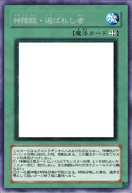 | このカードはエクストラデッキに入れなければならない。神属性がアドバンス召喚に成功した時、発動出来る。この魔法カードは全てのカード効果受けつけしない。 ① 神属性は罠カードとLv10以下モンスター効果(LVを持たないモンスター含む)受付しない。また戦闘以外の方法でフィールドから離れない。 ②ラーの翼神竜が特殊召喚が可能になる。特殊召喚した場合、通常召喚として扱いターン終了後に墓地へおく。 | |||