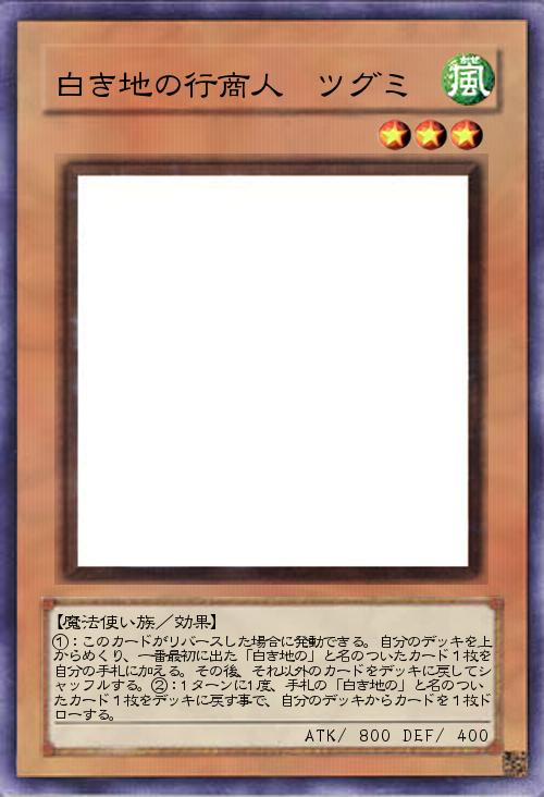 「「白き地の」版の魔導雑貨商人。悪用を防ぐためにめくったカードはデッキに戻してみたり。手札入れ替え効果もありますが、低ステータス故に1度発動できたらいい方でしょう。以下、妄想背景ストーリーです。