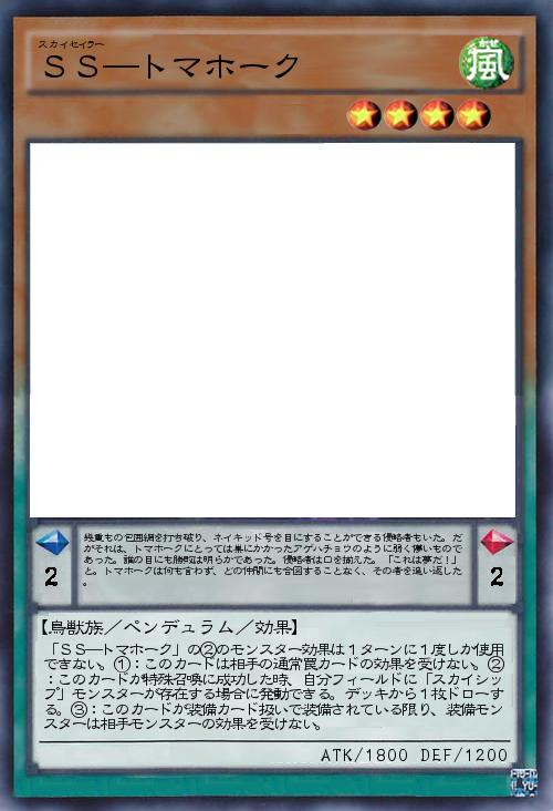 | 「SS―トマホーク」の②のモンスター効果は1ターンに1度しか使用できない。①:このカードは相手の通常罠カードの効果を受けない。②:このカードが特殊召喚に成功した時、自分フィールドに「スカイシップ」モンスターが存在する場合に発動できる。デッキから1枚ドローする。③:このカードが装備カード扱いで装備されている限り、装備モンスターは相手モンスターの効果を受けない。 | |||
