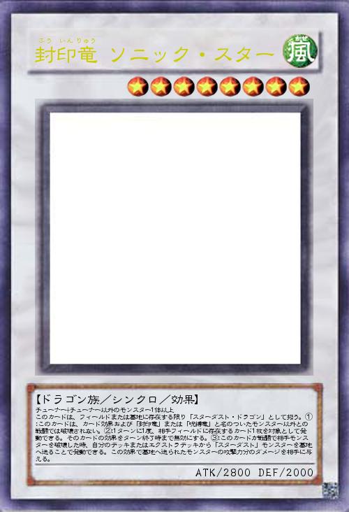 | チューナー+チューナー以外のモンスター1体以上 このカードは、フィールドまたは墓地に存在する限り「スターダスト・ドラゴン」として扱う。①:このカードは、カード効果および「封印竜」または「呪縛竜」と名のついたモンスター以外との戦闘では破壊されない。②:1ターンに1度、相手フィールドに存在するカード1枚を対象として発動できる。そのカードの効果をターン終了時まで無効にする。③:このカードが戦闘で相手モンスターを破壊した時、自分のデッキまたはエクストラデッキから「スターダスト」モンスターを墓地へ送ることで発動できる。この効果で墓地へ送られたモンスターの攻撃力分のダメージを相手に与える。 | |||