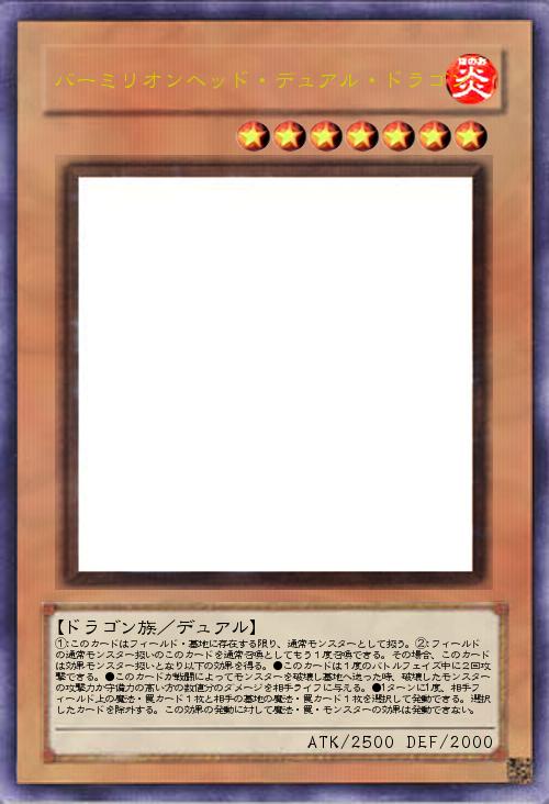 「「本編でデュアルが活躍してもいいじゃん」と思って作ってみました。効果を詰め込みすぎた感がありますが、そこは気にしない。「朱光の宣告者」に倣い、効果モンスターを朱色(バーミリオン)として、「デュアル」を自身の性格(デュアルモンスター)と双頭にかけて見ました。」(2015-07-10 23:58)
