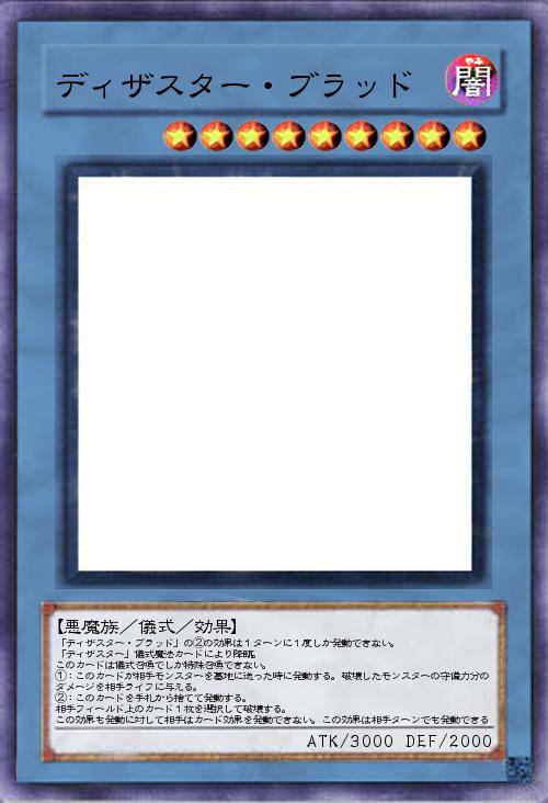 | 「ディザスター・ブラッド」の②の効果は1ターンに1度しか発動できない。 「ディザスター」儀式魔法カードにより降臨。 このカードは儀式召喚でしか特殊召喚できない。 ①:このカードが相手モンスターを墓地に送った時に発動する。破壊したモンスターの守備力分のダメージを相手ライフに与える。 ②:このカードを手札から捨てて発動する。 相手フィールド上のカード1枚を選択して破壊する。 この効果も発動に対して相手はカード効果を発動できない。この効果は相手ターンでも発動できる | |||