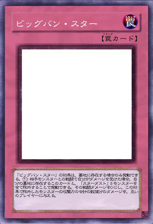| 「ビッグバン・スター」の効果は、墓地に存在する場合のみ発動できる。①:相手モンスターとの戦闘で自分がダメージを受けた場合、自分の墓地に存在するこのカードと、「スターダスト」Sモンスターを全て除外することで発動できる。その戦闘ダメージを0にし、この効果で除外したモンスターの攻撃力の合計の数値分のダメージを、互いのプレイヤーに与える。 | |||
