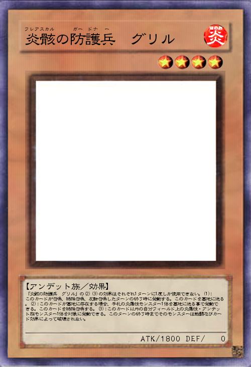 | 「炎骸の防護兵 グリル」の(2)(3)の効果はそれぞれ1ターンに1度しか使用できない。(1):このカードが召喚、特殊召喚、反転召喚したターンの終了時に発動する。このカードを墓地に送る。(2):このカードが墓地に存在する場合、手札の炎属性モンスター1体を墓地に送る事で発動できる。このカードを特殊召喚する。(3):このカード以外の自分フィールド上の炎属性・アンデット族モンスター1体を対象に発動できる。このターンの終了時までそのモンスターは戦闘及びカード効果によって破壊されない。 | |||