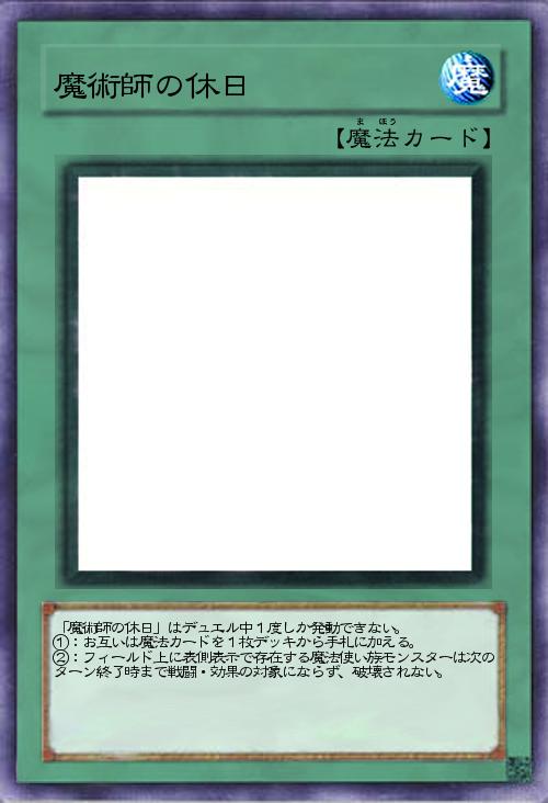 | 「魔術師の休日」はデュエル中1度しか発動できない。 ①:お互いは魔法カードを1枚デッキから手札に加える。 ②:フィールド上に表側表示で存在する魔法使い族モンスターは次のターン終了時まで戦闘・効果の対象にならず、破壊されない。 | |||