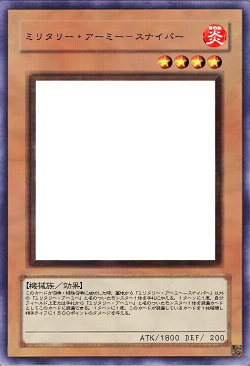 | このカードが召喚・特殊召喚に成功した時、墓地から「ミリタリー・アーミー-スナイパー」以外の「ミリタリー・アーミー」と名のついたモンスター1体を手札に加える。1ターンに1度、自分フィールド上または手札から「ミリタリー・アーミー」と名のついたモンスター1体を装備カードとしてこのカードに装備できる。1ターンに1度、このカードが装備しているカードを1枚破壊し相手ライフに1500ポイントのダメージを与える。 | |||