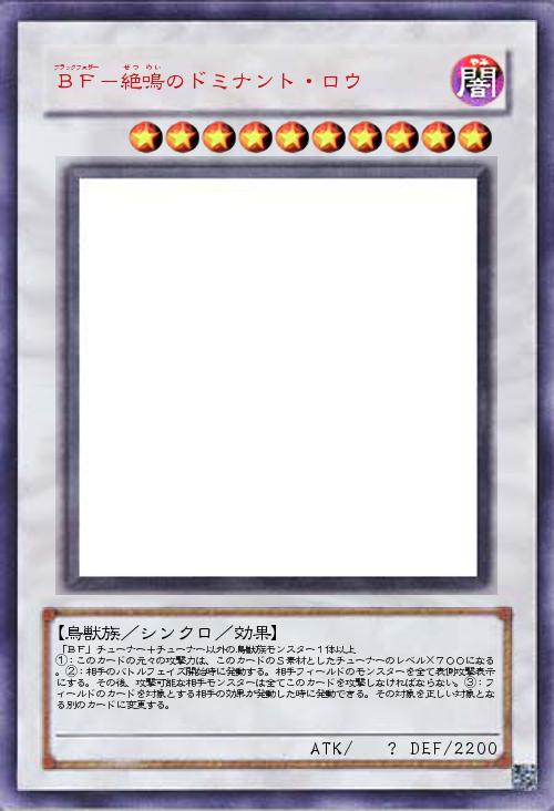 | 「BF」チューナー+チューナー以外の鳥獣族モンスター1体以上 ①:このカードの元々の攻撃力は、このカードのS素材としたチューナーのレベル×700になる。②:相手のバトルフェイズ開始時に発動する。相手フィールドのモンスターを全て表側攻撃表示にする。その後、攻撃可能な相手モンスターは全てこのカードを攻撃しなければならない。③:フィールドのカードを対象とする相手の効果が発動した時に発動できる。その対象を正しい対象となる別のカードに変更する。 | |||