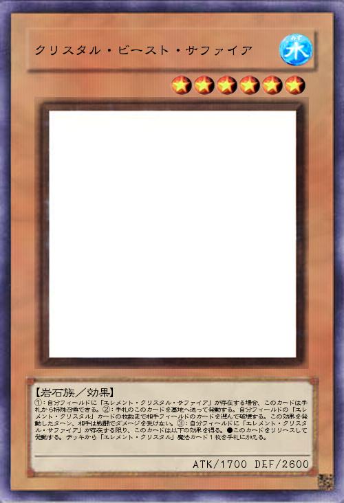 | ①:自分フィールドに「エレメント・クリスタル・サファイア」が存在する場合、このカードは手札から特殊召喚できる。②:手札のこのカードを墓地へ送って発動する。自分フィールドの「エレメント・クリスタル」カードの枚数まで相手フィールドのカードを選んで破壊する。この効果を発動したターン、相手は戦闘でダメージを受けない。③:自分フィールドに「エレメント・クリスタル・サファイア」が存在する限り、このカードは以下の効果を得る。●このカードをリリースして発動する。デッキから「エレメント・クリスタル」魔法カード1枚を手札に加える。 | |||