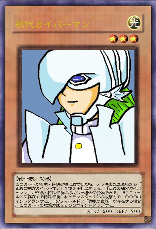 | このカードが召喚・特殊召喚に成功した時、デッキまたは墓地から「正義の味方カイバーマン」1体を手札に加える。「正義の味方カイバーマン」が召喚・特殊召喚に成功した場合に発動できる。相手フィールドに存在する特殊召喚されたモンスター1体の攻撃力を1000ポイントダウンする。自分フィールドに「青眼の白龍」が存在する場合、このカードの攻撃力は2800ポイントアップする。 | |||
