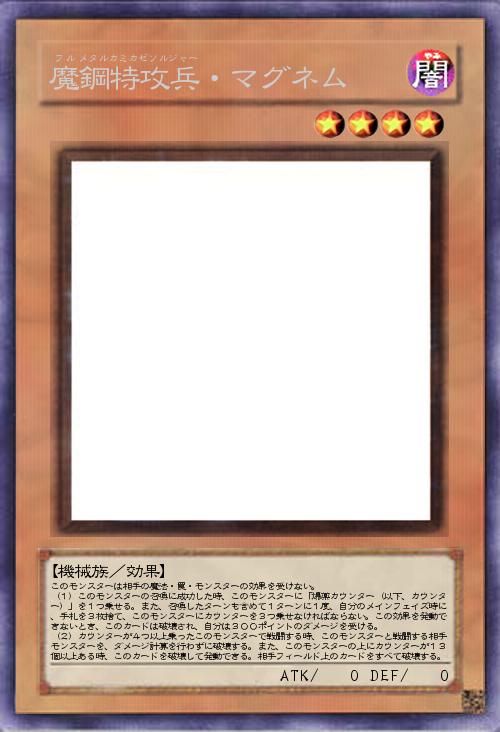 | このモンスターは相手の魔法・罠・モンスターの効果を受けない。 (1)このモンスターの召喚に成功した時、このモンスターに「爆薬カウンター(以下、カウンター)」を1つ乗せる。また、召喚したターンも含めて1ターンに1度、自分のメインフェイズ時に、手札を3枚捨て、このモンスターにカウンターを3つ乗せなければならない。この効果を発動できないとき、このカードは破壊され、自分は300ポイントのダメージを受ける。 (2)カウンターが4つ以上乗ったこのモンスターで戦闘する時、このモンスターと戦闘する相手モンスターを、ダメージ計算を行わずに破壊する。また、このモンスターの上にカウンターが13個以上ある時、このカードを破壊して発動できる。相手フィールド上のカードをすべて破壊する。 | |||