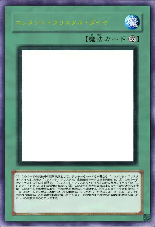 | ①:このカードの発動時の効果処理として、デッキからカード名が異なる「エレメント・クリスタル・ダイヤ」以外の「エレメント・クリスタル」永続魔法カード2枚を発動する。②:このカードがフィールドに存在する限り、「エレメント・クリスタル・ダイヤ」以外の自分フィールドの「エレメント・クリスタル」は破壊されない。③:このカードを含む2枚以上のカードが破壊される場合、このカードを破壊する事で、その効果を無効にして破壊する。④:このカードを含む自分フィールドのカードを2枚以上墓地へ送って発動する。デッキから「クリスタル・ビースト・ダイヤ」を特殊召喚する。この効果で特殊召喚したモンスターの攻撃力はこの効果の発動時に墓地へ送ったカードの枚数×300アップする。 | |||