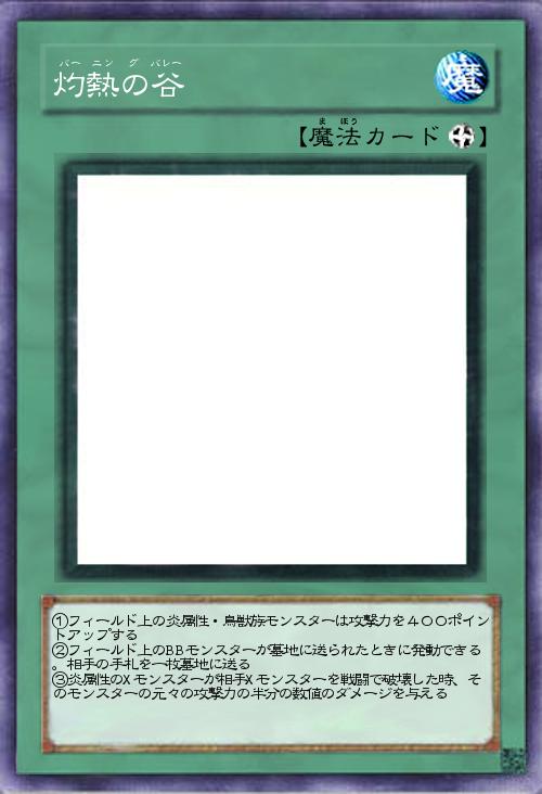 | ①フィールド上の炎属性・鳥獣族モンスターは攻撃力を400ポイントアップする ②フィールド上のBBモンスターが墓地に送られたときに発動できる。相手の手札を一枚墓地に送る ③炎属性のXモンスターが相手Xモンスターを戦闘で破壊した時、そのモンスターの元々の攻撃力の半分の数値のダメージを与える | |||