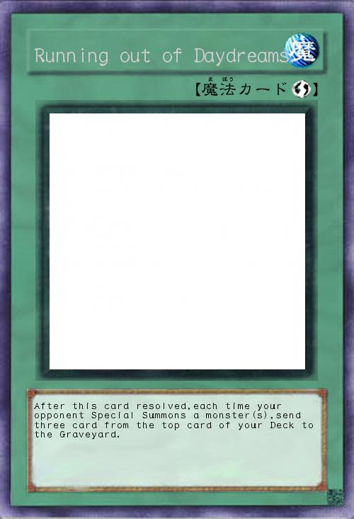 「『このカードの発動後、相手がモンスターを特殊召喚したとき、自分のデッキの上から3枚を墓地に送る。』といった辺りでしょうか。カード名はよく分かりませんが……『白昼夢からの追放』?」(2015-07-19 16:38)