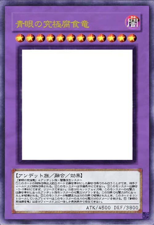 | 「青眼の究極竜」+アンデット族・闇属性モンスター ①このカードの特殊召喚は上記のカードを融合素材にした融合召喚でのみ行うことができ、相手フィールド上に特殊召喚される。②このモンスターは守備表示にできない。③このモンスターは融合・S・X素材にできず、リリースできない。④自分のエンドフェイズ時、このモンスターの攻撃力は融合素材となったアンデット族モンスターの攻撃力分ダウンする。この効果で攻撃力が0になったとき破壊される。⑤このモンスターが戦闘または④の効果で破壊されたとき、このカードをコントロールしていたプレイヤーはこのモンスターの元々の攻撃力分のダメージを受ける。⑥「青眼の究極腐食竜」は自分フィールド上に一体しか表側表示で存在できない。 | |||
