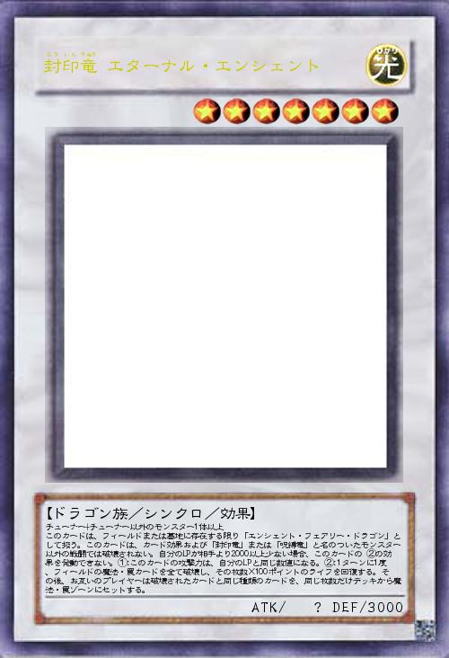 | チューナー+チューナー以外のモンスター1体以上 このカードは、フィールドまたは墓地に存在する限り「エンシェント・フェアリー・ドラゴン」として扱う。このカードは、カード効果および「封印竜」または「呪縛竜」と名のついたモンスター以外の戦闘では破壊されない。自分のLPが相手より2000以上少ない場合、このカードの ②の効果を発動できない。①:このカードの攻撃力は、自分のLPと同じ数値になる。②:1ターンに1度、フィールドの魔法・罠カードを全て破壊し、その枚数×100ポイントのライフを回復する。その後、お互いのプレイヤーは破壊されたカードと同じ種類のカードを、同じ枚数だけデッキから魔法・罠ゾーンにセットする。 | |||