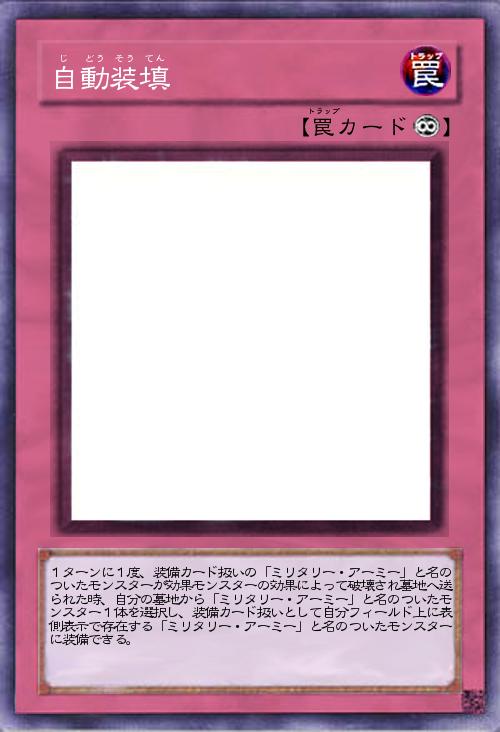| 1ターンに1度、装備カード扱いの「ミリタリー・アーミー」と名のついたモンスターが効果モンスターの効果によって破壊され墓地へ送られた時、自分の墓地から「ミリタリー・アーミー」と名のついたモンスター1体を選択し、装備カード扱いとして自分フィールド上に表側表示で存在する「ミリタリー・アーミー」と名のついたモンスターに装備できる。 | |||