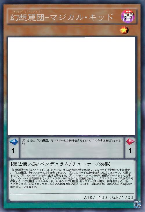 | 「幻想麗団-マジカル・キッド」は1ターンに1度しか特殊召喚できない。このカードをS素材とする場合、「幻想麗団」SモンスターしかS召喚できない。 ①:このカードは特殊召喚に成功したターン、攻撃できない。②:このカードは相手に直接攻撃できる。③:このモンスターが相手に戦闘ダメージを与えた場合、このカードを表側表示でエクストラデッキに送ることで発動できる。エクストラデッキに表側表示で存在する「幻想麗団-マジカルキッド」以外の「幻想麗団」モンスターを1体選び、特殊召喚する。④:このモンスターがエクストラデッキからの特殊召喚に成功した場合、発動できる。相手の手札の枚数×200のダメージを与える。 | |||