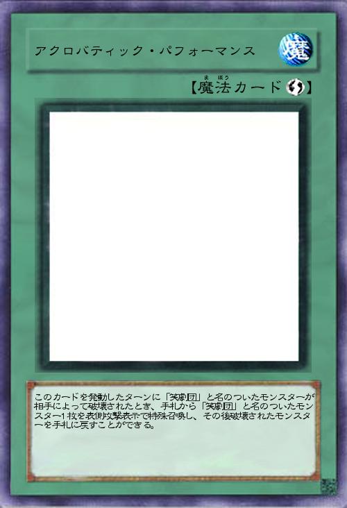 | このカードを発動したターンに「笑劇団」と名のついたモンスターが相手によって破壊されたとき、手札から「笑劇団」と名のついたモンスター1枚を表側攻撃表示で特殊召喚し、その後破壊されたモンスターを手札に戻すことができる。 | |||