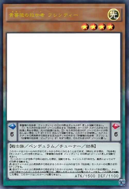 | 黄薔薇の救世者 フレンディー」の②の効果はデュエル中1度しか発動できない。 ①:もう片方の自分のPゾーンに存在する「救世者」カードのPスケールが元々の数値と異なる場合、元々の数値になる。②:もう片方の自分のPゾーンにカードが存在しない場合、LPを1000支払って発動できる。このカードを破壊し、エクストラデッキで表側表示で存在するまたはデッキの中から「赤薔薇の救世者 ラブリ」と「白薔薇の救世者 ピュアリー」を1枚ずつ選び、それぞれ自分のPゾーンに置く。 | |||