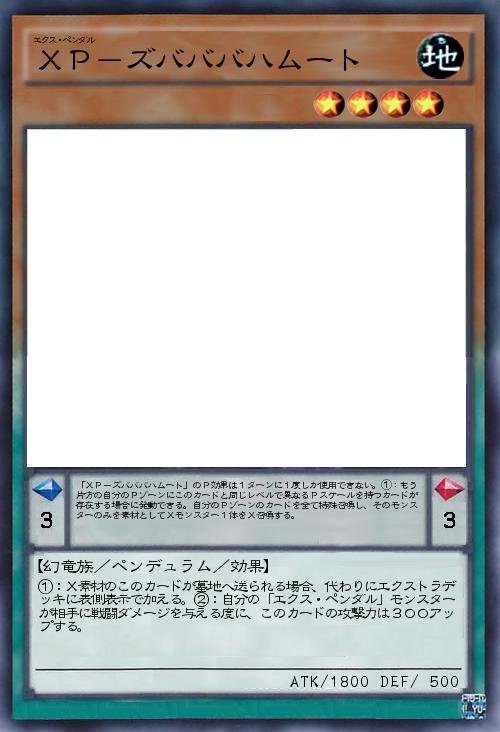 | 「XP-ズバババハムート」のP効果は1ターンに1度しか使用できない。①:もう片方の自分のPゾーンにこのカードと同じレベルで異なるPスケールを持つカードが存在する場合に発動できる。自分のPゾーンのカードを全て特殊召喚し、そのモンスターのみを素材としてXモンスター1体をX召喚する。 | |||