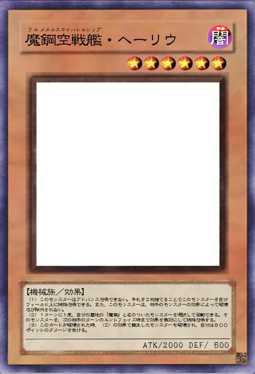 | (1)このモンスターはアドバンス召喚できない。手札を2枚捨てることでこのモンスターを自分フィールド上に特殊召喚できる。また、このモンスターは、相手のモンスターの効果によって破壊及び除外されない。 (2)1ターンに1度、自分の墓地の「魔鋼」と名のついたモンスターを選択して発動できる。そのモンスターを、次の相手のターンのエンドフェイズ時まで効果を無効にして特殊召喚する。 (3)このカードが破壊された時、(2)の効果で蘇生したモンスターも破壊され、自分は800ポイントのダメージを受ける。 | |||