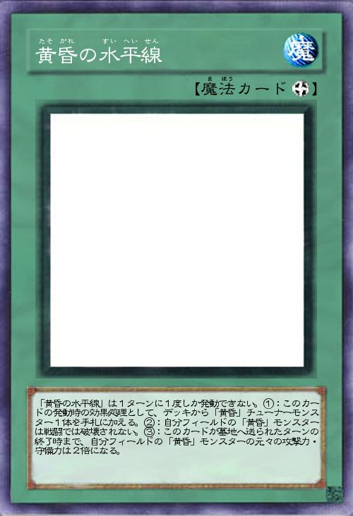 | 「黄昏の水平線」は1ターンに1度しか発動できない。①:このカードの発動時の効果処理として、デッキから「黄昏」チューナーモンスター1体を手札に加える。②:自分フィールドの「黄昏」モンスターは戦闘では破壊されない。③:このカードが墓地へ送られたターンの終了時まで、自分フィールドの「黄昏」モンスターの元々の攻撃力・守備力は2倍になる。 | |||